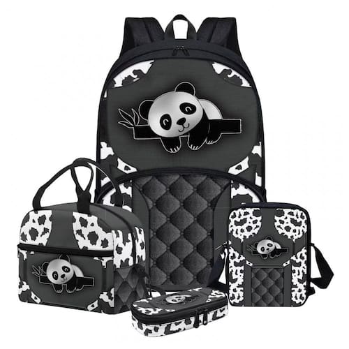Modelo: Conjunto mochila escolar 4 peças prata com estampa de pandas