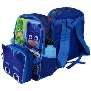CONJUNTO DE MOCHILA DE 4 PEÇAS PJ MASKS PARA CRIANÇAS Este conjunto de mochila PJ Masks é essencial para VOLTAR À ESCOLA. O conjunto inclui uma mochila de com bolso frontal com zíper e apresenta todos os três PJ Mask Super Heroes Catboy, Gekko e Owlettte, uma lancheira 3D Cat Boy destacável, uma garrafa de água e uma bola de inquietação mole.
