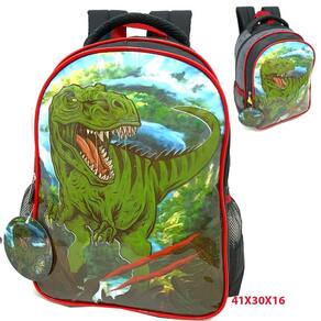 Mochila Infantil Escolar Dinossauro É super resistente e confortável para seu filho. Internamente possui amplo espaço para apostilas grandes e todo o material escolar que seu filho irá precisar. Sem contar que a mochila infantil com tema Dinossauro sempre está na moda Características da Mochila Infantil: - Compartimento principal com espaço para apostilas grandes e livros; - Bolso frontal com fechamento em zíper para melhor organização; - Alça de mão reforçada; - Alças acolchoadas e ajustáveis, para melhor conforto; - Bolsos laterais para transporte de garrafinhas; - Estampa frontal em PVC; - Puxadores dos zíperes emborrachados e personalizados; - Etiqueta de identificação nas costas; - Material: 100% poliéster. Dimensões: - Altura: 41 cm - Largura: 30 cm - Profundidade: 13 cm - Peso: 500 gramas