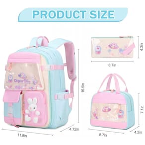Mochila escolar infantil FIXITOK com tema de coelho kawaii, desenvolvida em conjunto de 3 peças composto por mochila, lancheira térmica e estojo, adequada para uso em educação infantil, ensino fundamental e atividades diárias. O design utiliza detalhes como lantejoulas peroladas, padrões em estilo cartoon e pelúcias decorativas, combinados em tons de azul água para compor um visual lúdico e infantil.
