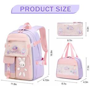 Mochila escolar infantil FIXITOK com tema de coelho kawaii em conjunto de 3 peças, composta por mochila, lancheira térmica e estojo, indicada para crianças e pré-adolescentes em idade escolar. O design em tom roxo e rosa combina lantejoulas peroladas, padrões cartoon e pelúcia de coelho aplicada na parte frontal, criando visual lúdico adequado ao uso em educação infantil, ensino fundamental e uso diário.
