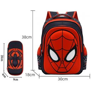 Mochila escolar Telifor tamanho 15" com painel frontal em relevo 3D inspirado em herói aracnídeo, indicada para meninos em idade escolar que precisam transportar livros, cadernos e materiais de estudo em quantidade maior. Acompanha estojo retangular coordenado, permitindo organizar canetas, lápis e pequenos acessórios de escrita de forma separada da área principal da mochila.