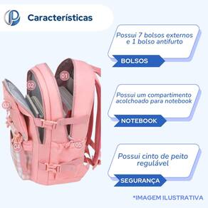 Principais Características: 7 bolsos externos 1 bolso antifurto 2 bolsos internos Compartimento acolchoado para notebook Cinto de peito ajustável Capacidade: 23 litros Marca: Não Informado