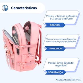 Principais Características: 7 bolsos externos 1 bolso antifurto 2 bolsos internos Compartimento acolchoado para notebook Cinto de peito ajustáve Capacidade: 23 litros