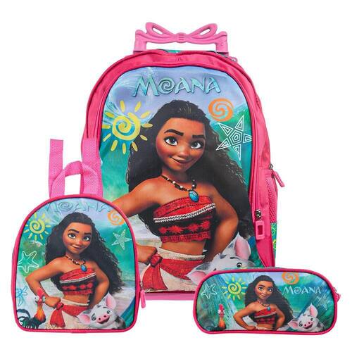 Kit Mochila Escolar Infantil Moana E Pua Com Rodinhas, acompanha lancheira e estojo. Agora pode levar sua mochila no seu dia a dia ou acompanhar você na escola. Possui alça de mão reforçada. Sua abertura maior se dá por zíper com puxador. Na parte de dentro possui amplo espaço para a guardar diversos materiais como cadernos, livros e estojos. Na parte da frente, possui bolso com zíper para a guardar pertences de menor tamanho, e bolsos laterais.
