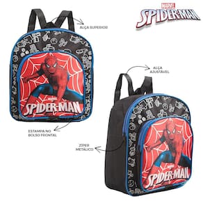 Kit Mochila Escolar Infantil Pequena do Homem Aranha de Costas, acompanha lancheira e estojo. Possui alça de mão reforçada. Agora você pode levar sua mochila no seu dia a dia ou acompanhar você na escola. Sua abertura maior se dá por zíper com puxador. Na parte de dentro possui espaço para a guardar diversos materiais como cadernos, livros e estojos. Na parte da frente, possui bolso com zíper para a guardar pertences de menor tamanho.