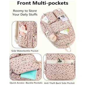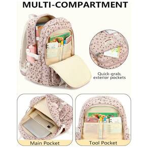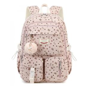 Mochila escolar QHRIDS em tecido cotelê (corduroy) macio de alta densidade, indicada para alunas de ensino fundamental, médio, faculdade e uso diário. O corpo da mochila oferece sete compartimentos em diferentes tamanhos, incluindo três bolsos com zíper para notebook de até 38 cm, tablet, livros e cadernos, dois bolsos frontais para itens de acesso rápido e dois bolsos laterais com elástico para garrafas ou guarda-chuva. ? As alças de ombro são acolchoadas com espuma espessa e ajustáveis, contribuindo para maior conforto em trajetos mais longos, enquanto o encosto conta com tira de fixação para acoplar em malas de viagem e bolso traseiro antirroubo para documentos e itens de valor. A presença de detalhes refletivos melhora a visibilidade em deslocamentos noturnos, mantendo o visual juvenil em corduroy rosa com laço decorativo.