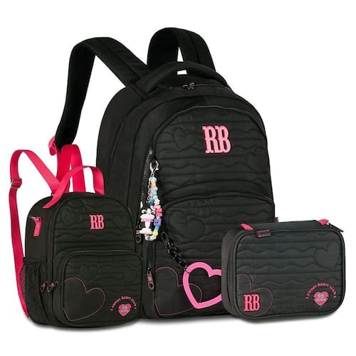 Cheio de estilo e praticidade, esse kit traz a combinação perfeita para a vida escolar. A mochila RB27010 é espaçosa e versátil, confeccionada em material soft com matelassê de corações, divisória para notebook, dois bolsos frontais, bolsos laterais telados e bolso antifurto. Conta ainda com alças acolchoadas ajustáveis, alça de mão reforçada e alça carona para malas. Dimensões aproximadas da mochila: 44x33x14cm. A lancheira RB27011 é um modelo 2 em 1 superprático: pode ser Utilizado transversal ou como mochilinha de costas, com revestimento térmico no compartimento principal, bolso frontal adicional e bolsos telados laterais. Dimensões aproximadas: 27x20x12cm. Para completar, o estojo RB27013 traz organização total com 36 elásticos internos, estojo interno separado e capacidade para até 100 itens. Dimensões aproximadas: 22x16x6cm. Um kit completo e cheio de personalidade, ideal para quem ama o estilo Rebecca Bonbon.
