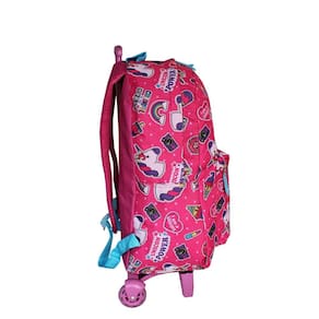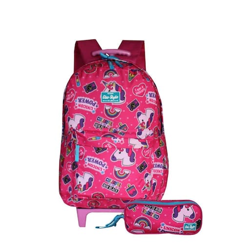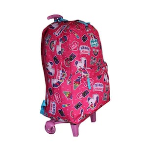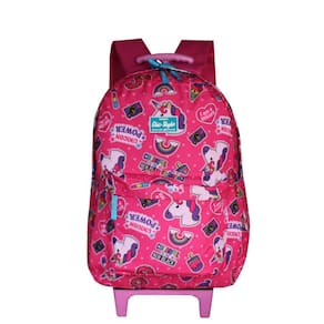 - Amplo espaço interno: - Tem 2 bolsos, sendo um principal para colocar livros, cadernos, etc e tem um segundo bolso frontal para colocar itens menores. - Alça superior reforçada para carregar a mochila na mão quando necessário. - Rodinhas de silicone reforçada. - Altura da haste do carrinho levantada em relação ao nível do solo é de 87 cm. - Alça das costas para carregar a mochila nas costas quando quiser com regulagem de tamanho. - Estampa linda que sua filha amar.