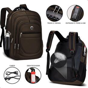 A mochila em material Nylon possui um encosto de espuma respiravel, proporcionando leveza e maciez. Ela conta com 5 bolsos externos com zíper, um compartimento interno para notebook e 2 bolsos laterais ideais para garrafas.
