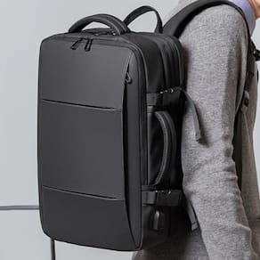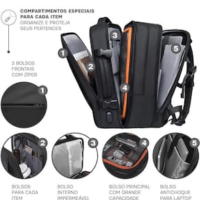 Características: PARTE EXTERNA - Design Funcional - Material Impermeável - Capacidade: Ajustável entre 24 e 45 Litros; - Bolsos Externos - Costura Reforçada com fino acabamento; - Saída USB com fechamento anti poeira - Bolso na alça de ombro para cartões e pequenos objetos; - Bolso secreto no costado para pequenos objetos como fones, carteiras, etc; - Alça Reforçada para Mão - Alça das Costas Ajustáveis com de 3 Camadas; - Alça no costado para fixação em alças de Malas de Mão; - Possui cintas laterais de segurança com regulagem; - Possui saída de ar no compartimento para calçados e roupas; - Abertura e Fechamento por Zíper duplos resistentes - Toda Mochila Possui Costuras Reforçadas Premium;