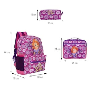 Kit Mochila Escolar Infantil Princesa Sofia Roxa, acompanha lancheira e estojo. Possui alça de mão reforçada. Agora você pode levar sua mochila no seu dia a dia ou acompanhar você na escola. Sua abertura maior se dá por zíper com puxador. Na parte de dentro possui amplo espaço para a guardar diversos materiais como cadernos, livros e estojos. Na parte da frente, possui bolso com zíper para a guardar pertences de menor tamanho e bolsos laterais.Características: Alça superior Estampa no bolso frontal Zíper metálico Bolso LateralMedidas Lancheira: Altura: 22cm Largura: 24cmMedidas Estojo: Altura: 10cm Comprimento: 23cmMedidas Mochila: Altura: 41cm Largura: 15cm Comprimento: 31cmDúvidas Frequentes:1. Ela possui alça ajustávelR. Sim, ela possui alça ajustável para melhor conforto.2. Ela possui estampa frontalR. Sim, ela possui estampa frontal3. Ela possui quantas divisõesR. Ela possui 03 divisões para guardar suas coisas.4. Qual o material da mochilaR. Ela é feita em poliéster e plástico.Tags: Mochila, Escola, Escolar, Princesa Sofia, Infantil, Costas, Passeio, Estojo, Lancheira, Bolsa, Menina, Juvenil, Reforçada, Desenho. Marca: Toys 2U