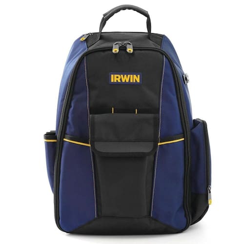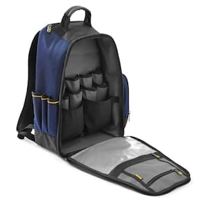 Mochila Ferramentas Serie Defender 2012167-LA com 27 bolsos para máximo armazenamento, estrutura resistente, bolso interno com zíper, pés emborrachados para durabilidade, costas e alças respiráveis e gancho para trena.