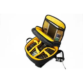 Mochila crazy zoomy para câmeras e equipamentos fotográficos - zm100A mochila zoomy é resistente e prática para o uso de seu equipamento e acessórios.Confeccionada em material de nylon semi impermeável e espuma pack que garante proteção contra impactos.Com divisórias internas ajustáveis e removíveis, você vai adptar de acordo com suas necessidades, oferecendo total conforto e segurança para sua câmera, lentes e outros acessórios.Uma bolsa compacta e eficiente que possui bolso frontal para tablet, cabos, carregadores, baterias e tudo mais que precise levar para seu dia a dia como fotógrafo.Produzida em nylon 1200 e espuma pack 11mmTotal proteção e resistência contra quedasMaterial de nylon sevilha, semi impermeável - resistente a água e intempériesBolso frontal com ziper e divisórias inteligentes - comporta tablet, cabos, carregadores, baterias e diversos acessóriosParte interna com divisórias ajustáveis e removíveisSugestão de uso / capacidade:1 câmera dslr com lente média acoplada1 lente pequena1 lente média1 flashBaterias, cabos, carregadores e acessóriosMedidas externas35cm altura32cm comprimento16cm larguraImagens meramente ilustrativas, produto não acompanha câmeras e acessórios. Marca: Crazy Bolsas