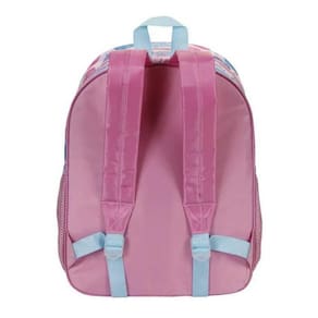 Possui amplo espaço, oferecendo praticidade para carregar diversos materiais, alças acolchoadas confortáveis e bolso frontal em PVC com estampa divertida.