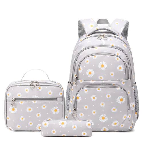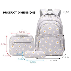 A mochila para meninas é feita de forro de poliéster e nylon de alta qualidade, resistente à água e resistente, fácil de limpar. O conjunto de mochila infantil vem com estojo de lápis com zíper e lancheira de material isolado, mantendo seu almoço fresco/aquecido; mochila leve - 2 bolsos grandes que você pode colocar cadernos, revistas, arquivos A4; 1 capa acolchoada para laptop no compartimento principal para laptop de 14 polegadas; 2 bolsos frontais com zíper para guardar outros itens; 2 bolsos laterais podem carregar uma garrafa de água e um guarda-chuva. A mochila é de ótima qualidade e linda estampa de margaridas. As alças acolchoadas são respiráveis e ajustáveis, design traseiro confortável. Perfeita para: escola, uso diário, viagens, acampamento, esportes ao ar livre, etc. Incluído na embalagem: 1 mochila + 1 lancheira + 1 estojo para caneta - Leve: painel traseiro confortável, alças de ombro ajustáveis largas e bem acolchoadas, alça superior de esponja e alça reforçada, alivia a carga nos ombros e mãos do seu filho para conforto o dia todo. - Tamanho da mochila: 29 cm C x 16 cm P x 43 cm A; Lancheira: 25 cm C x 11 cm P x 21 cm A; Bolsa de lápis: 20 cm C x 6 cm P x 6 cm A (Pacote: 1 mochila, 1 lancheira, 1 estojo de lápis) . - Grande capacidade: Mochila: Interior -- 2 compartimentos principais espaçosos, 1 seção acolchoada embutida para laptop de 14 polegadas; Exterior -- 2 bolsos frontais com zíper, 2 bolsos laterais de malha ajustáveis para carregar garrafa de água ou guarda-chuva. Lancheira: tem uma função de isolamento térmico, uma bolsa de malha embutida e uma bolsa com zíper na parte externa frontal. - Impermeável: a mochila é feita de tecido de nylon respirável, resistente à água, leve e resistente, fácil de limpar, não há necessidade de se preocupar com os livros ficarem molhados em dias chuvosos, ela exibe resistência ao desgaste e resistência ao rasgo para proporcionar durabilidade e longa vida útil. - Mochila com estampa margarida: é uma linda mochila de cor brilhante para uso diário de meninas e crianças. Use-a como mochila escolar, bolsa de viagem, mochila para laptop, bolsas de esportes ao ar livre, lancheira. dando às crianças a sensação mais confortável e melhor, é o presente perfeito e a melhor escolha para crianças. Idade mínima recomendada pelo fabricante: 4 anos.