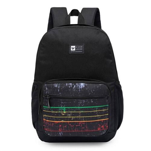 Mochila Hang Loose com compartimento principal, compartimento frontal, logo bordado centralizado, alças ajustáveis e etiquetas personalizadas.
