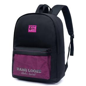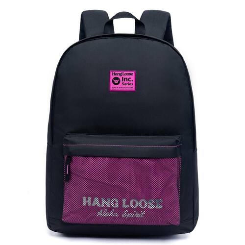 Mochila Hang Loose com compartimento principal, compartimento frontal, bordado frontal e etiquetas personalizadas.