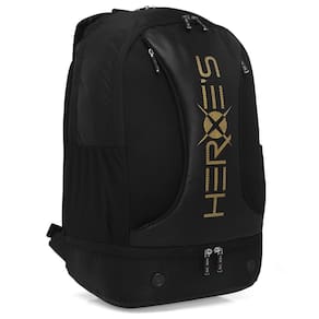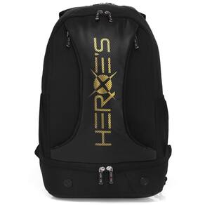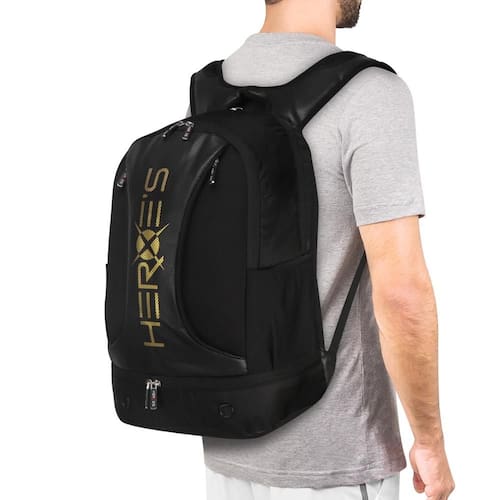 - Detalhamento: Possui um compartimento principal acolchoado com capacidade para duas raquetes sem capa, além de um compartimento adicional para melhor organização dos itens. Conta ainda com um bolso na base para calçados, bolsos laterais em mesh ideais para objetos pequenos e alças ajustáveis e acolchoadas que facilitam o transporte. A escrita "Heroes" está estampada na parte frontal;