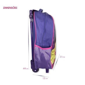 Esse kit é perfeito para atender todas as necessidades da criança. Vem com uma mochila de rodinhas com compartimento principal espaçoso ideal para acomodar os livros, cadernos e materiais escolares no geral e mais dois bolsos laterais de redinha para garrafas. Vem com uma lancheira térmica com espaço suficiente para levar todo lanchinho da criança e mantê-los frescos, tem alça para ser carregada na mão ou no ombro e também vem com alça para encaixe na mochila. Além disso, vem com um estojo para acomodar todos os lápis de cor e canetinhas. ESPECIFICAÇÕES: Material: Poliéster Dimensões: Mochila - 41cm altura x 31cm largura x 12cm profundidade Lancheira - 18cm altura x 22cm largura x 9cm profundidade Estojo - 23cm comprimento x 7cm altura Capacidade Mochila: 15 Litros Peso: 800gr aprox. Cor: Roxa Estampa: Princesas Itens: Mochila de rodinhas, Lancheira Térmica e Estojo CONTÉM: 01 Kit Mochila de Rodinha Princesas com 3 Peças na cor Roxa