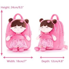 A mochila infantil Gloveleya boneca asiática rosa é indicada para crianças pequenas, com corpo em pelúcia macia e boneca integrada vestida em tons de rosa, em formato compacto e leve, com compartimento principal adequado para pequenos brinquedos, lanches, acessórios e um tablet infantil de até aproximadamente 8,5", para uso em passeios, escola infantil e atividades de lazer. ?