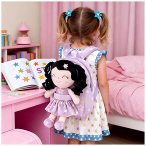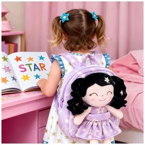 A mochila infantil Gloveleya boneca primavera é indicada para crianças pequenas, com estrutura em pelúcia macia em formato de boneca de cabelo cacheado, vestido com estampa de estrelas roxas e compartimento principal adequado para lanches, pequenos brinquedos e objetos pessoais leves, em tamanho compacto adequado ao uso diário infantil em passeios, escola infantil e atividades de lazer. ?