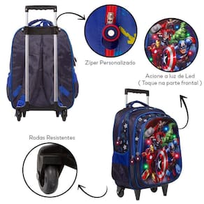 Mochila Escolar Infantil Vingadores Rodinhas possui alça de mão reforçada. Agora você pode levar sua mochila no seu dia a dia ou acompanhar você na escola. Sua abertura maior se dá por zíper com puxador. Na parte de dentro possui amplo espaço para a guardar diversos materiais como cadernos, livros e estojos. Na parte da frente, possui luzes de led que piscam na frente, tornando-a ainda mais divertida e atraente.