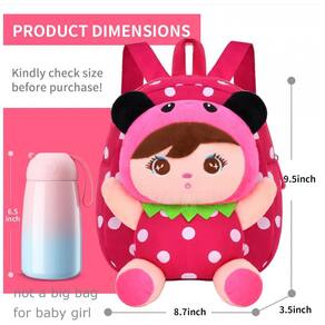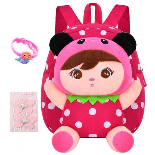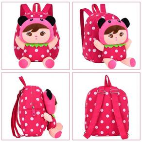 Mochila infantil compacta em lona com boneca de pelúcia na parte frontal, indicada para crianças de aproximadamente 1 a 5 anos para uso em creche, pré-escola, passeios e pequenas viagens. O corpo da mochila utiliza canvas resistente com forro interno macio, oferecendo espaço para lanchinhos, brinquedos pequenos, livros infantis e outros itens de uso diário.