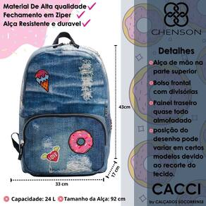 Espaçoso compartimento principal. Alças retas e almofadadas. Bolso frontal com divisórias. Painel traseiro parcialmente almofadado. Alça de mão na parte superior. Algumas estampas não são centralizadas e por isso, a posição do desenho pode variar em certos modelos devido ao recorte do tecido.