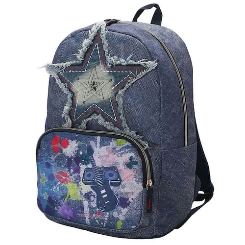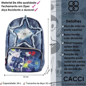 Espaçoso compartimento principal. Alças retas e almofadadas. Bolso frontal com divisórias. Painel traseiro parcialmente almofadado. Alça de mão na parte superior. Algumas estampas não são centralizadas e por isso, a posição do desenho pode variar em certos modelos devido ao recorte do tecido.