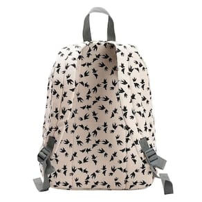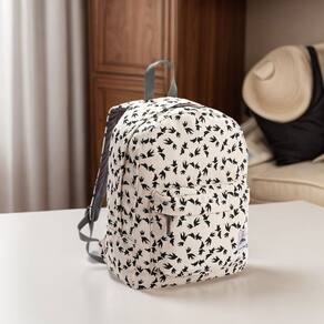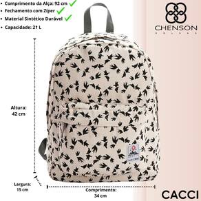 Espaçoso compartimento principal. Alças retas e almofadadas. Bolso frontal com divisórias. Painel traseiro parcialmente almofadado. Alça de mão na parte superior. Algumas estampas não são centralizadas e por isso, a posição do desenho pode variar em certos modelos devido ao recorte do tecido.
