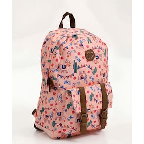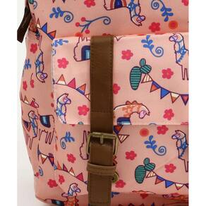 Mochila feminina confeccionada em tecido. Possui estampa lhama, fechamento por zíper, repartição única, forro, bolso lapela frontal com tira, alça de mão, alças traseiras ajustáveis, acabamento em costura no tom.