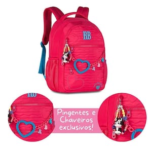 Cada detalhe foi pensado para encantar: chaveiro de miçangas exclusivo com mascote em 3D, corrente estilizada com coração emborrachado e puxadores de zíper personalizados que completam o design sofisticado. As alças de costas são acolchoadas, ajustáveis e extremamente confortáveis, enquanto a alça de mão superior e a alça carona facilitam o transporte em qualquer ocasião.
