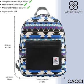 A Mochila de Costas Juvenil Teen Etnico é confeccionada em material resistente, com base reforçada, parte interna forrada e alças acolchoadas e ajustáveis para garantir conforto a quem utilizá-la. Possui dois compartimentos, sendo um bolso externo e uma abertura principal, com divisória interna, para armazenamento de materiais do dia a dia.