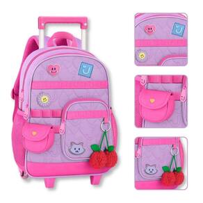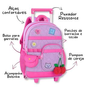 O Kit Escolar Juju Teófilo foi criado para oferecer praticidade, organização e muito estilo às rotinas escolares. Ele reúne três itens essenciais: Mochila, Lancheira Térmica e Estojo Box. A mochila de carrinho da coleção Juju Teófilo é puro encanto e foi pensada para acompanhar as pequenas com muito estilo, conforto e praticidade na rotina escolar. Confeccionada em poliéster soft com acabamento em matelassê, ela traz patches emborrachados e de tecido que deixam o visual ainda mais delicado e divertido, além de acompanhar um charmoso chaveiro de cerejinhas e uma bolsinha exclusiva que completa o look de forma única. Possui compartimento principal amplo, ideal para organizar materiais escolares, pastas ou até uma troca de roupinhas, além de um compartimento frontal espaçoso com divisórias internas que ajudam a manter tudo no lugar. Na parte frontal, conta ainda com mais um bolso adicional de fácil acesso, perfeito para pequenos objetos, e bolsos telados nas laterais para garrafinhas ou itens de uso rápido. O carrinho com haste retrátil facilita o transporte no dia a dia, garantindo conforto também para crianças menores. As alças permitem o uso nas costas quando necessário, oferecendo versatilidade no uso. Dimensões aproximadas: 40x30x13cm. Lancheira Térmica JU26303: Conta com compartimento principal com revestimento térmico, perfeito para manter lanches e bebidas na temperatura ideal. Fechamento em zíper, bolsinho frontal prático, alça transversal para uso confortável e alça carona para acoplar diretamente na mochila. Dimensões: 23 20 11 cm. Estojo Box: Estojo amplo com estrutura firme e elásticos internos para acomodar até 36 lápis. Inclui um compartimento interno adicional, separado, também com fechamento por zíper. Dimensões: 22 16 6 cm. Este conjunto oferece organização completa, alta durabilidade e o visual exclusivo da coleção Juju Teófilo, garantindo um kit completo, funcional e cheio de personalidade. Marca: Não Informado