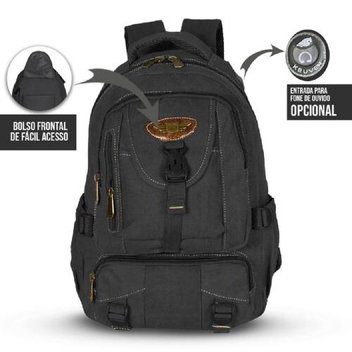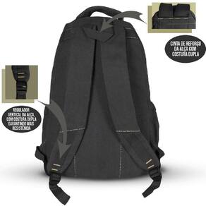 Interior da mochila todo forrado em náilon . Mochila Confecciona em Lona de alta qualidade ultra resistente. Material reforçado com Costuras duplas e Reforçadas. Alça de Mão e Costas Acolchoadas para maior conforto. Divisória Simples para Notebook. 1 Compartimento Grande Muito Espaçoso. 2 Compartimentos Frontais médios Com zíper. 2 compartimento frontais pequenos com zíper. 2 Bolsos Laterais Com elástico e Regulador. Alça de costas com costuras extras super reforçadas . Puxador do zíper em metais Resistente não quebra . Peso:750 g. Capacidade: 28 Litros. Material: 100% Lona Grossa.