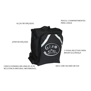 Loja Oficial Giro Moto Parts A Mochila reforçada da Giro Moto Parts by Piracapas é perfeita para viagens de moto ou para serviços de motoboy e entregas. Conta com 02 bolsos para carga, alça manual na parte superior, alças reforçadas, base emborrachada e faixas reletivas.Especificações:• Marca: Piracapas• Medidas: Largura: 35cm / Altura: 45cm / Profundidade: 18cm• Capacidade: 28 Litros• Tamanho: P• Material: Nylon impermeabilizado, Argolas frontais em ferro e abs reforçado, reforçada em lonaConteúdo da Embalagem:01- Mochila De Lona Entrega Motoqueiro Logo Giro Moto Parts Tamanho P Marca: Não Informado