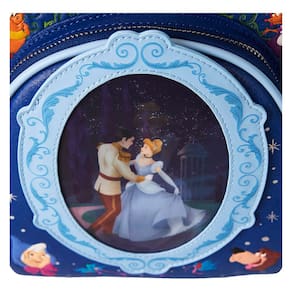 Loungefly Disney Cinderela Mini Mochila Lenticular 75th Anniversary - Características: couro vegano (poliuretano), alças ajustáveis e acolchoadas, alça superior resistente, arte de personagens em todos os lados, ferragens de metal prateadas, relevo, apliques, folha de prata, glitter, lenticular, bordado, detalhes impressos e forro interno combinado. - Dimensões: 22 cm L x 27 cm A x 11 cm P - Esta mochila é um produto oficialmente licenciado pela Disney.