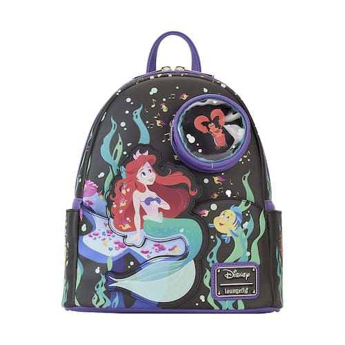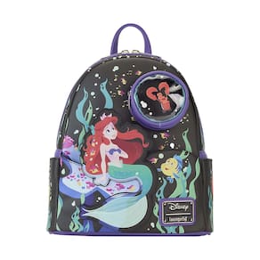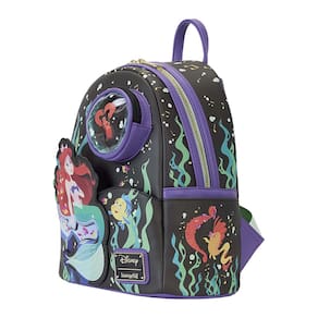 Loungefly Disney A Pequena Sereia 35º Aniversário Life is the Bubbles Mini Mochila, Preto - Dimensões da mochila: 23 cm L x 26,7 cm A x 11,4 cm P (a largura é medida na parte inferior da mochila.) - As características da mochila incluem ferragens de metal dourado, alças acolchoadas ajustáveis, bolsos laterais, couro vegano (poliuretano) e detalhes estampados, PVC, apliques e que brilham no escuro. Observe o forro combinado. Esta mochila é um produto oficialmente licenciado pela Disney.
