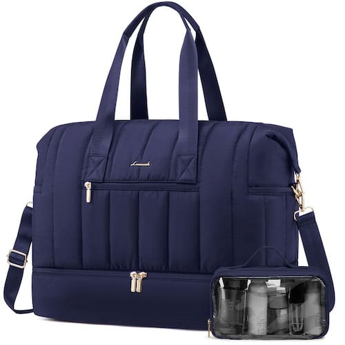 Bolsa de viagem acolchoada - Macia e leve: a bolsa esportiva de viagem LOVEVOOK é feita de Taslon macio, grosso e durável, proporcionando uma experiência de transporte confortável. Zíperes resistentes e costura garantem durabilidade duradoura. As bolsas esportivas combinam estilo e função. Expresse com confiança seu senso de estilo único enquanto carrega todos os seus itens essenciais com facilidade. Caminhe na linha entre moda e funcionalidade. - Dimensões da bolsa de mão de avião: a bolsa de viagem feminina LOVEVOOK atende à maioria dos requisitos internacionais de bagagem de mão. Pode ser guardada no compartimento superior e sob o assento como um item pessoal durante o voo. A capa de carrinho integrada desliza sobre a alça da bagagem. Há um bolso com zíper na parte traseira para o seu smartphone, identidade ou passaporte. A bolsa de embarque ideal para o fim de semana para viagens de negócios ou pessoais. - Bolsa feminina estilosa de fim de semana e pernoite: esta bolsa esportiva grande pode armazenar itens essenciais diários por 3 a 7 dias. Vários bolsos para manter seus pertences pessoais organizados. Na frente da bolsa esportiva de viagem, há um bolso para fácil acesso a eletrônicos ou materiais de viagem. A bolsa de viagem de algodão de pelúcia atende às maiores necessidades e fantasias da mulher urbana moderna para bolsas de viagem. - Bolsa de ginástica com separação úmida e seca e armário de sapatos independente: a bolsa interna de separação úmida e seca é feita de material impermeável de alta densidade, que pode ajudá-lo a separar itens úmidos e secos. Esta bolsa esportiva feminina de academia tem um compartimento inferior separado para sapatos e outros itens. Também pode ser usada como bolsa hospitalar. - Versátil para todas as aventuras: se você estiver indo para a academia, embarcando em viagens de avião e viagens de trailer, ou procurando uma bolsa hospitalar chique para parto feminino, esta bolsa esportiva se adapta a todos os aspectos do seu estilo de vida ativo.