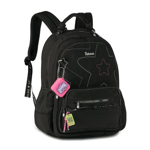 A mochila de costas Luluca LU27033 é sinônimo de estilo e praticidade para acompanhar a rotina escolar e os momentos do dia a dia. Disponível em três cores incríveis - Preto, Rosa e Lilás - ela é confeccionada em poliéster de alta qualidade, com matelassê colorido de estrelas, placa de metal com resina e detalhes em metais pretos/ônix que deixam o visual ainda mais sofisticado.