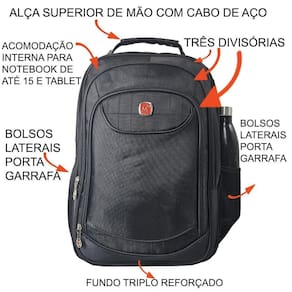 Mochila note15 cabo de aço bf41 + capa - compartimento principal com zíper duplo reforçado - compartimento interno acolchoado e fecho - garantindo a proteção extra do seu laptop - compartimento central com zºiper - compartimento frontal com divisorias internas organizadoras de canetas, celular, chave, agenda etc - bolso frontal com ziper - bolsos laterais em tela e elastico - cabo de aço - mais forte - sistema de fluxo de ar nas costas - costas acolchoadas - alças acolchoadas e ajustaveis