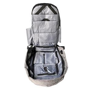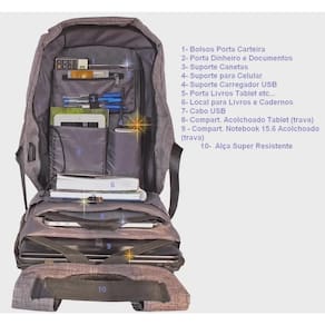 Material: Poliéster; Tamanho: 17, 43x30x13,5cm; Zíper e bolsos ocultos; Compartimento para notebook; Cabo USB incluso; Porta USB integrada.