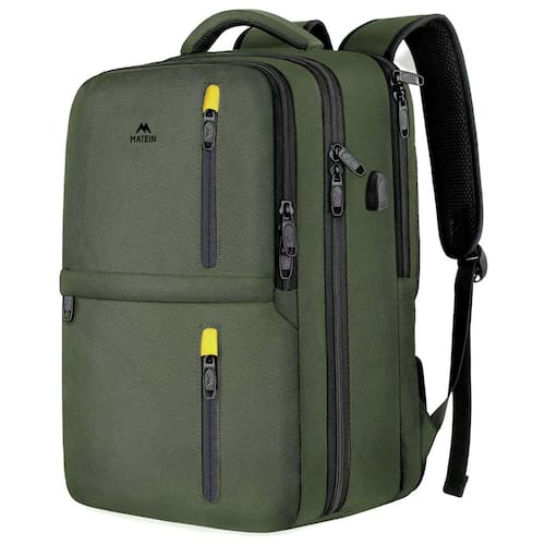 Ótima opção de presente. A mochila organizadora de viagem a torna adequada para uso diário e escapadas aos fins de semana. Torne sua viagem metódica O ótimo parceiro para faculdade, escritório, negócios, viagens, férias e qualquer outra ocasião diária Presentes práticos de férias para viajantes, amigos, mães, pais, homens ou mulheres. Características: Resistente, leve Antifurto: o bolso traseiro oculto pode guardar passaporte, celular, carteira; o zíper duplo do bolso para laptop é projetado com zíperes de metal trancáveis e seguro contra ladrões. No entanto, o cadeado não está incluído no pacote. Prepare-se sozinho, se necessário. Compartimento separado para laptop: cabe laptops de até 17 polegadas e Macbook O compartimento de sapatos na parte inferior da mochila é ótimo para sapatos de tamanho 10 a 12 para sapatos femininos e masculinos. Bolsos de malha elástica resistente no lado esquerdo, adequado para garrafa de água, guarda-chuva compacto pequeno ou outros itens. Design respirável com acolchoamento de espuma macia nas costas, alças de ombro e pega, a textura interna é fina, dá a você o máximo de suporte para as costas A mochila de viagem para laptop é bem feita de tecido de poliéster resistente à água e resistente, pode proteger seus itens pessoais da chuva leve. Sobre a MATEIN: Na Matein, fornecemos mochilas da mais alta qualidade com o valor mais razoável para que todos os clientes possam encontrar uma mochila que adorem carregar. Criamos produtos que inspiram as pessoas a viver suas vidas com paixão; explorando, criando e vivendo a vida no momento. - MULTICOMPARTAMENTO: Dimensões 20 (A) x 13 (C) x 8 (L) polegadas, peso leve 1 kg (2,2 lb). A mochila de viagem tem um compartimento separado para laptop que pode conter o computador de 17,3 polegadas e proteger o laptop de se mover; o compartimento principal com zíperes duplos tem espaço de armazenamento suficiente para guardar suas necessidades diárias para uma viagem noturna; o compartimento organizador tem muitos bolsos para manter seus itens organizados e mais fáceis de encontrar; há muitos outros bolsos para diferentes propósitos - Compartimento para sapatos: o compartimento para sapatos é feito na parte inferior da mochila para viagens, mantendo os sapatos separados. Este armazenamento de sapatos é largo o suficiente para guardar o tamanho 10-12 para sapatos femininos e masculinos, que também podem ser utilizados como bolsas de higiene pessoal e para outros usos; há dois orifícios de ventilação no compartimento para sapatos, tornando-o respirável - Funcional e segura: interface USB com design de cabo embutido, ótima conveniência para carregar seus dispositivos eletrônicos conectando seu próprio carregador portátil. O design confortável e respirável das costas oferece o máximo suporte para as costas; uma alça de bagagem permite que a mochila de viagem masculina deslize com segurança sobre a alça de qualquer bagagem com rodinhas para transporte com as mãos livres, transporte mais fácil. Com um bolso oculto antirroubo na parte de trás protege seus itens valiosos de ladrões - Material confiável: a mochila de viagem para laptop é bem feita de tecido de poliéster de alta densidade e repelente à água com zíperes de metal; há zíperes de metal bloqueáveis no bolso do laptop para proteger seu computador ou objetos de valor de ladrões (você precisa trancar o compartimento para laptop com sua própria trava); a alça acolchoada de espuma é confortável de carregar por um longo tempo - Capacidade espaçosa: a capacidade das malas de viagem é de 40 L. Você pode carregá-la para o avião. A mochila de bagagem atende aos requisitos de bagagem de mão da maioria das companhias aéreas, cabe perfeitamente sob o assento ou no compartimento suspenso, serve para você como bolsa de mão pessoal de viagem, viagem de negócios, mochila de atividades ao ar livre, ótima para homens, mulheres; presentes exclusivos de dia dos namorados para homens. Este item não se destina ao uso por menores de 12 anos