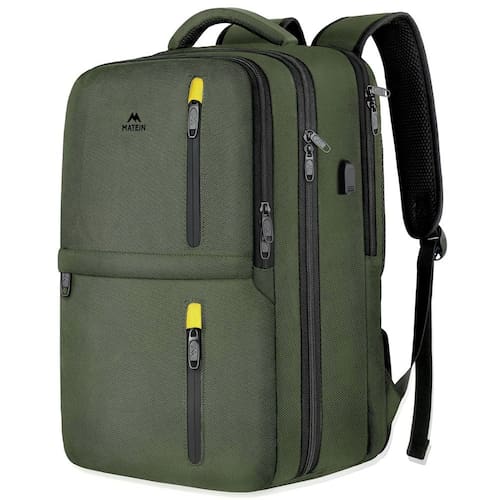 Ótima opção de presente. A mochila organizadora de viagem a torna adequada para uso diário e escapadas aos fins de semana. Torne sua viagem metódica O ótimo parceiro para faculdade, escritório, negócios, viagens, férias e qualquer outra ocasião diária Presentes práticos de férias para viajantes, amigos, mães, pais, homens ou mulheres. Características: Confiável, leve Antifurto: o bolso traseiro oculto pode guardar passaporte, celular, carteira; o zíper duplo do bolso para laptop é projetado com zíperes de metal trancáveis e seguro contra ladrões. No entanto, o cadeado não está incluído no pacote. Prepare você mesmo se necessário. Compartimento separado para laptop: serve para laptops e Macbook de até 18,4 polegadas O compartimento de sapatos na parte inferior da mochila é ótimo para sapatos de tamanho 10 a 12 para sapatos femininos e masculinos. Bolsos de malha elástica resistente no lado esquerdo, adequado para garrafa de água, guarda-chuva compacto pequeno ou outros itens. Design respirável com acolchoamento de espuma macia nas costas, alças de ombro e pega, a textura interna é fina, dá a você o máximo de suporte para as costas A mochila de viagem para laptop é bem feita de tecido de poliéster resistente à água e de qualidade, pode proteger seus itens pessoais da chuva leve. Sobre a MATEIN: Na Matein, fornecemos mochilas da mais alta qualidade com o valor mais razoável para que todos os clientes possam encontrar uma mochila que adorem carregar. Criamos produtos que inspiram as pessoas a viver suas vidas com paixão; explorando, criando e vivendo a vida no momento. - MULTICOMPARTAMENTO: Dimensões 21 (A) x 13,5 (C) x 8,5 (L) polegadas, peso leve 1,05 kg (2,3 lb). A mochila para laptop de viagem tem um compartimento separado para laptop que pode conter computadores de 18,5 polegadas e proteger o laptop de se movimentar; o compartimento principal com zíperes duplos tem espaço de armazenamento suficiente para guardar suas necessidades diárias para uma viagem noturna; o compartimento organizador tem muitos bolsos para manter seus itens organizados e mais fáceis de encontrar; há muitos outros bolsos para diferentes propósitos - Compartimento para sapatos: o compartimento para sapatos é feito na parte inferior da mochila extra grande para manter os sapatos separados e tudo o mais organizadamente. Este armazenamento de sapatos é largo o suficiente para guardar o tamanho 10-12 para sapatos femininos e masculinos, que também podem ser utilizados como bolsas de higiene pessoal e para outros usos; há dois orifícios de ventilação no compartimento para sapatos, tornando-o respirável - Funcional e segura: interface USB com design de cabo integrado, ótima conveniência para carregar seus dispositivos eletrônicos conectando seu próprio carregador portátil; o design traseiro respirável e confortável oferece o máximo suporte para as costas; uma alça de bagagem permite que a mochila de fim de semana deslize com segurança sobre a alça de qualquer bagagem com rodinhas para transporte com as mãos livres, transporte mais fácil. Com um bolso oculto antirroubo na parte de trás protege seus itens valiosos de ladrões - Material confiável: a mochila de transporte extra grande para aviões é bem feita de tecido de poliéster de alta densidade e repelente à água com zíperes de metal; há zíperes de metal bloqueáveis no compartimento do laptop para proteger seu computador ou objetos de valor de ladrões (você precisa trancar o compartimento do laptop com sua própria trava); a alça acolchoada de espuma é confortável de carregar por um longo tempo - Capacidade espaçosa: a capacidade das bolsas de mão é de 45 L. Você pode carregá-la no avião. A mochila de mão TSA Friendly garante um uso seguro e duradouro todos os dias ou fim de semana, serve bem como bolsa de mão pessoal de viagem, viagem de negócios, mochila de atividades ao ar livre, ótima para homens e mulheres. Presentes exclusivos de Dia dos Namorados para homens. Este item não se destina ao uso por menores de 12 anos