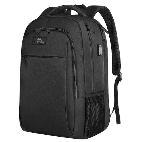 MATEIN Extra Large Backpack, 17 Inch Travel Laptop Backpack with USB Charging Port, Anti Theft TSA Friendly Business Work College Computer Backpack for Men Women, Black - Muito espaço de armazenamento e bolsos: um compartimento separado para laptop comporta laptop de 18,4 polegadas, bem como laptop de 18, 17,3 e 15,6 polegadas. Um compartimento espaçoso espaçoso para necessidades diárias, acessórios eletrônicos tecnológicos. Compartimento frontal com muitos bolsos, bolsos para caneta e gancho para chaveiro, torna seu item organizado e mais fácil de encontrar - Design de porta USB: com carregador USB embutido no exterior e cabo de carregamento embutido no interior, esta mochila USB oferece a você uma maneira mais conveniente de carregar seu telefone enquanto caminha. É um ótimo presente tecnológico para ele de esposa, filha e filho. Observe que esta mochila não se alimenta, a porta de carregamento USB oferece apenas um acesso fácil para carregar - Confortável e resistente: design traseiro acolchoado macio e confortável com acolchoamento ventilado de vários painéis espessos, mas macios, oferece o máximo suporte para as costas. Alças de ombro respiráveis e ajustáveis aliviam o desconforto do ombro. Alça superior acolchoada de espuma para um longo tempo de uso - Funcional e segura: uma alça de bagagem permite que a mochila se encaixe na bagagem/mala, deslize sobre o tubo da alça vertical para facilitar o transporte. Com um bolso oculto antirroubo na parte de trás protege seus itens valiosos de ladrões. Bem feita para viagens de avião internacionais e viagens de um dia como um presente de viagem para homens - Material durável e sólido: feito de tecido de poliéster resistente à água e durável com zíperes de metal. Garante um uso seguro e duradouro todos os dias e finais de semana. Serve bem como bolsa de trabalho de escritório, bolsa fina de carregamento USB, mochilas de volta para a faculdade