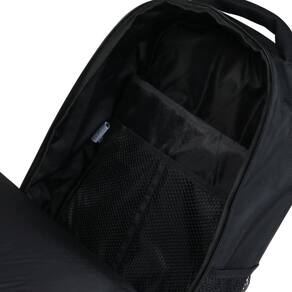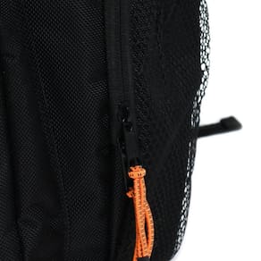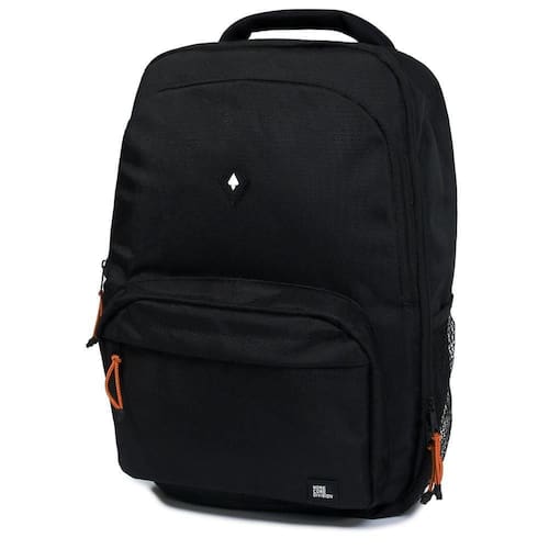 Mochila MCD com compartimento grande para notebook, um medio e um frontal menor. Bolso em telinha nas laterais, dois logos emborrachados e puxador contrastante laranja.