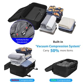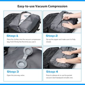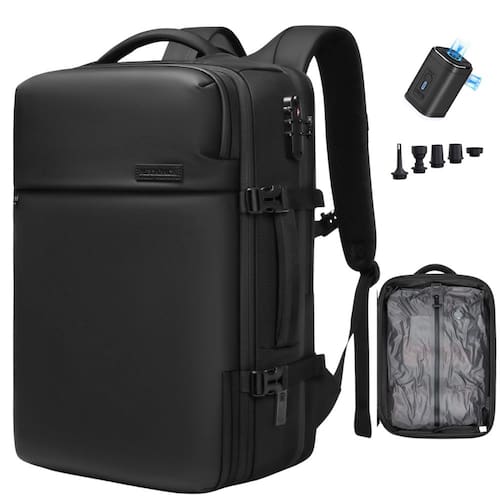 MEGABACK Mochila airbag, mochila de viagem de 70 L com sistema de compressão a vácuo. A mochila MEGABACK Airbag é a melhor companhia de viagem para aqueles que procuram uma mochila de viagem a vácuo com conveniência imbatível e eficiência de embalagem. Com um sistema de compressão a vácuo integrado, este sistema de compressão a vácuo de mochila de viagem ajuda você a maximizar seu espaço de embalagem, expandindo até 70 L, perfeito para viagens mais longas ou como bagagem de mão. Feita de materiais de alta qualidade, resistentes à água e ecológicos, a mochila de compressão a vácuo é projetada para suportar todas as condições climáticas e manter seus pertences secos. A mochila de compressão para viagens utiliza uma bolsa de compressão a vácuo, garantindo que suas roupas estejam firmemente seladas e organizadas. Se você estiver indo em uma viagem de negócios, férias ou aventura ao ar livre, esta mochila a vácuo para viagem oferece o espaço que você precisa sem o tamanho volumoso. Com suas capacidades de mala a vácuo de ar, a mochila MEGABACK Air Backpack a vácuo para viagem permite que você viaje de forma mais inteligente. Os sacos de vácuo de viagem incluídos com bomba permitem que você comprima suas roupas e equipamentos, economizando até 50% mais espaço. A mochila de viagem com airbag a vácuo é projetada com vários compartimentos, incluindo um compartimento separado para sapatos sem odor, uma capa acolchoada para laptop que cabe em um dispositivo de até 19 polegadas e um bolso oculto antirroubo para seus objetos de valor. Principais características: 1. Capacidade expansível de 70 litros: comprima seus pertences com o sistema de viagem de mochila de compressão a vácuo e expanda até 70 L. 2. Durável e à prova d'água: feita de materiais premium resistentes à água, como nylon reciclado 900D, garantindo uso duradouro e proteção contra os elementos. 3. Mochila de 70 L com 9 compartimentos de armazenamento inteligentes: inclui 2 bolsos frontais, 1 compartimento expansível principal, 1 compartimento para sapatos, 2 bolsos internos com zíper e um compartimento para laptop. 4. Design confortável e ergonômico: Possui alças de ombro acolchoadas e ajustáveis e painéis traseiros respiráveis para conforto durante viagens longas. 5. Trava aprovada pela TSA: para maior segurança, a mochila de ar com trava TSA mantém seus pertences seguros durante sua viagem. Se você estiver indo em uma viagem longa ou curta, ou viajando a negócios, a mochila MEGABACK com vedação a vácuo é a solução perfeita para ajudar você a se manter organizado e viajar com facilidade. - ?Capacidade expansível de 70 L e compressão a vácuo?O aspirador de pó Megaback oferece uma capacidade de 70 L, expandindo de 55 x 35 x 23 cm para 55 x 35 cm para espaço adicional. Pesando apenas 2 kg, esta mochila de viagem com vedação a vácuo usa um sistema de compressão a vácuo para maximizar a embalagem, tornando-a perfeita para longas viagens e aventuras - ?Materiais premium à prova d'água com embalagem a vácuo?Feita de nylon reciclado de alta qualidade 900D e 840D, a mochila Megaback Airpack com embalagem a vácuo é feita para durar. Seu design resistente à água mantém seu equipamento seco, enquanto o sistema de compressão a vácuo à base de TPU maximiza o espaço para viagens eficientes. Materiais duráveis e ecológicos garantem um desempenho duradouro - ?9 compartimentos para armazenamento e segurança inteligentes?Esta mochila a vácuo com bomba possui 9 compartimentos, incluindo 2 bolsos frontais, um compartimento para sapatos sem odor, um compartimento principal de compressão a vácuo expansível, 2 bolsos internos com zíper, um compartimento acolchoado para laptop (até 48 cm), um bolso impermeável para garrafa e um bolso oculto antifurto. O cadeado aprovado pela TSA adiciona segurança extra aos seus pertences - ?Separação seca e úmida, compartimento para sapatos sem odor?A mochila de compressão Megaback organiza seus equipamentos de forma eficiente com bolsos dedicados para separação seca e úmida, perfeita para armazenar roupas úmidas ou eletrônicos. O compartimento para sapatos sem odor mantém os calçados separados e frescos, garantindo que suas roupas permaneçam limpas e frescas em movimento - ?Confortável, design ergonômico e uso multiuso?Projetada para o máximo conforto, a mochila de ar Megaback com bomba possui alças ergonômicas, ajustáveis, acolchoamento respirável e uma estrutura resistente. Seja para viagens, negócios ou aventuras ao ar livre, seu design multiuso a torna sua companheira perfeita, reduzindo a tensão e melhorando a mobilidade
