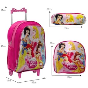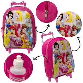 Kit Mochila Escolar Infantil Princesas Rodinhas, acompanha lancheira e estojo. Possui alça de mão reforçada. Agora você pode levar sua mochila no seu dia a dia ou acompanhar você na escola. Sua abertura maior se dá por zíper com puxador. Na parte de dentro possui amplo espaço para a guardar diversos materiais como cadernos, livros e estojos. Na parte da frente, possui bolso com zíper para a guardar pertences de menor tamanho e bolsos laterais.