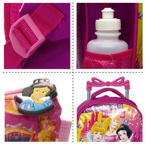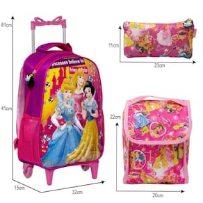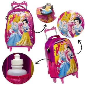 Kit Mochila Escolar Infantil Princesas Rodinhas, acompanha lancheira e estojo. Possui alça de mão reforçada. Agora você pode levar sua mochila no seu dia a dia ou acompanhar você na escola. Sua abertura maior se dá por zíper com puxador. Na parte de dentro possui amplo espaço para a guardar diversos materiais como cadernos, livros e estojos. Na parte da frente, possui bolso com zíper para a guardar pertences de menor tamanho e bolsos laterais.